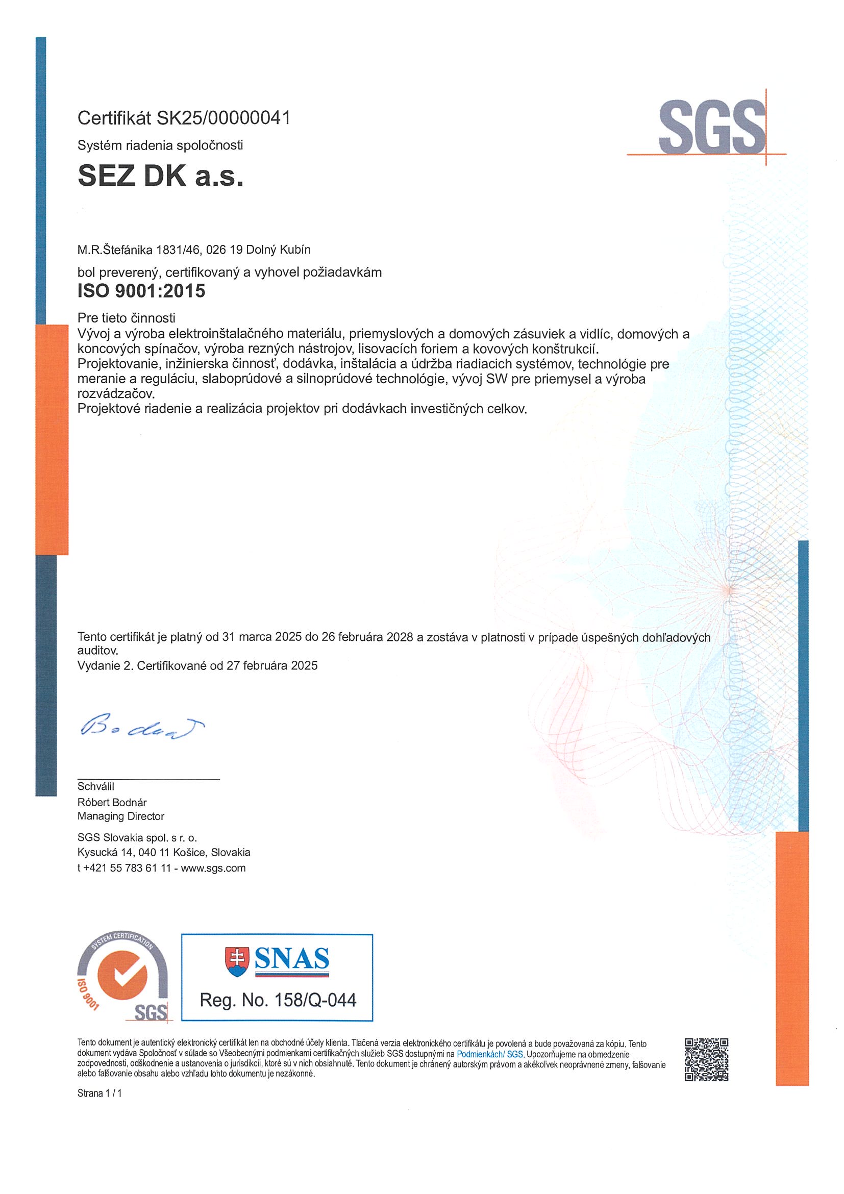 Naša spoločnosť SEZ DK a.s. bola založená v roku 1947 ako jeden z prvých závodov vybudovaných v rámci industrializácie Česko-Slovenska. Od svojho založenia až po súčasnosť budujeme tradíciu vo výrobe elektroinštalačného materiálu. Vďaka dlhoročnej tradícii, skúsenostiam a špičkovej technológii v oblasti lisovania si upevňujeme postavenie lídra na trhu.